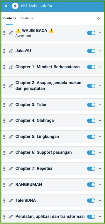 Materi diakses di member area khsusus, berupa learning management system (LMS) yang bisa diakses kapanpun, di manapun. Pakai HP / laptop.